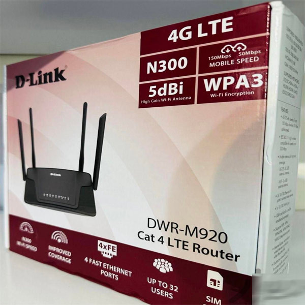 ورژن جدید روتر بی سیم 4G/LTE دی-لینک مدل DWR-M920 محصولی از شرکت «دی- لینک » است. این روتر شرکت دی-لینک دارای یک درگاه برای نصب سیمکارت است که میتوانید از سیمکارت تمام اپراتورها استفاده کنید. در کنار شیار سیمکارت، چهار درگاه LAN وجود دارد که میتوان از آن برای اتصال باسیم ابزارها به شبکه بیسیم استفاده کرد. همچنین این دستگاه میتواند از طریق اتصال WAN به اینترنت فعلی شما وصل میشود. این اتصال میتواند شامل یک اینترنت پهنباند باشد که به وسیله آنتنهای پوینت تو پوینت (P2P) وایرلس دریافت میکنید یا همان اتصال ADSL خانگیتان که مدتها از آن استفاده کردهاید. برای این دستگاه چهار عدد آنتن در نظر گرفته شده است که دوتای آنها برای اتصال آنتنهای 3G/4G است و دو تای دیگر برای آنتنهای شبکهی وایفای هستند. در قسمت پشت روتر DWR-M920 کلیدهای WPS و Reset و کلید روشن و خاموش قرار گرفته است.