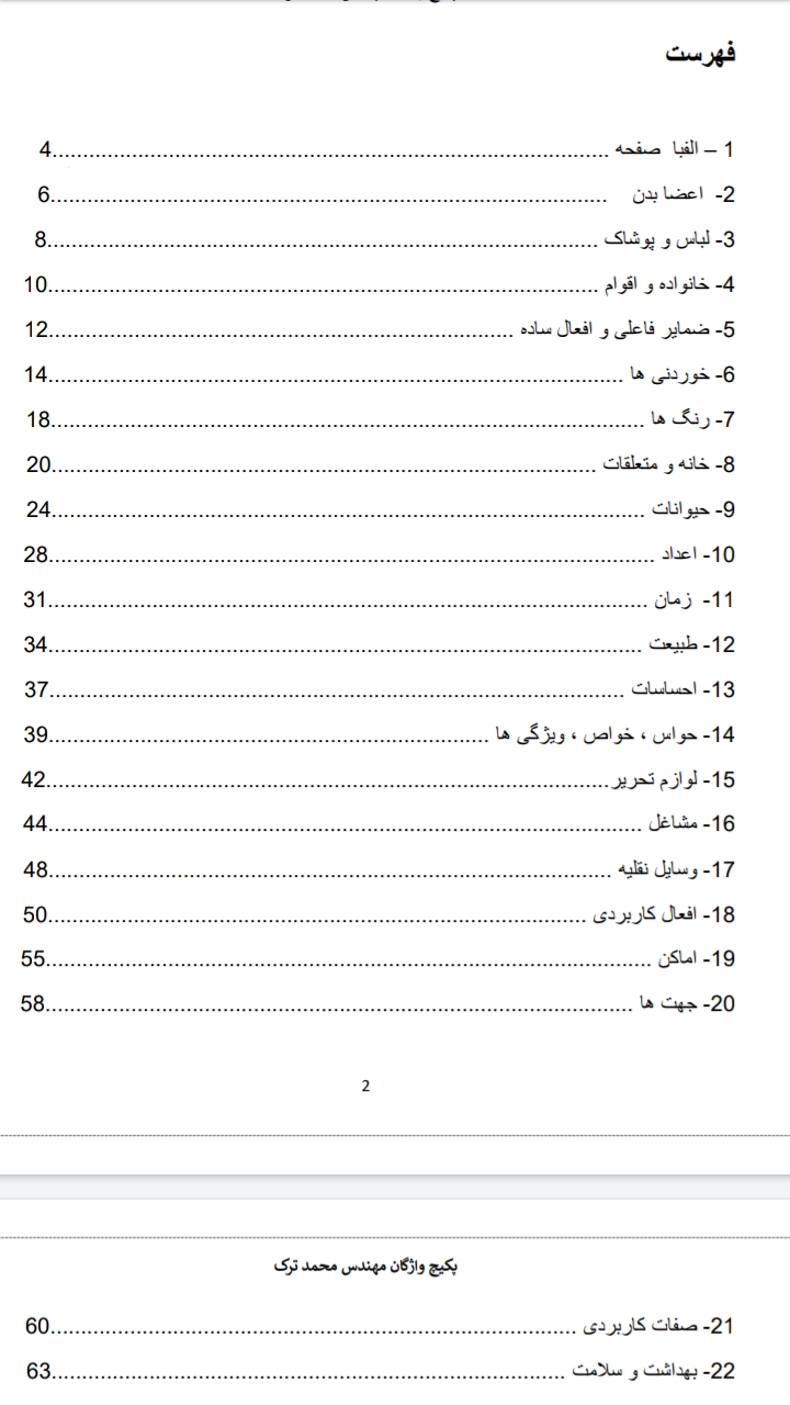 این محصول اولین پکیج واژگان کاربردی زبان انگلیسی هست که به صورت کاملا دسته بندی شده ارائه میشود . کسانی که میخواهند زبان انگلیسی را فرا بگیرند به یک منبع از واژگان نیاز دارند که پرت نباشد بلکه لغات را مرحله به مرحله و طبقه بندی شده آموزش دهد . این محصول تمام کلماتی که باید بدانید را در ۳۴ بخش اصلی ارائه میدهد . این جزوه همچون ساختار یک کتاب آموزشی ، دارای فهرست ، شماره گذاری ، تلفظ دقیق آمریکن و ترجمه فارسی بوده که حدود ۱۰۶ صحفه میشود و شما میتوانید هم از روی تلفن همراه ، تبلت و رایانه مطالعه کنید یا پرینت بگیرید و از روی کاغذ بهره مند شوید . دانش آموزان ، زبان آموزان در هر سطحی ، بزرگسالان ، آموزشگاه های زبان و معلمان عزیز میتوانند از نسخه دیجیتال یا پرینت فایل استفاده کنند . با اسکن بارکد روی محصول میتوانید وارد کانال آموزشی شوید و تمام بخش های جزوه را با مثال های صوتی و تصویری ، آهنگ و فیلم فرا بگیرید که در فهم و یادگیری بهتر قطعا موثر خواهد بود .