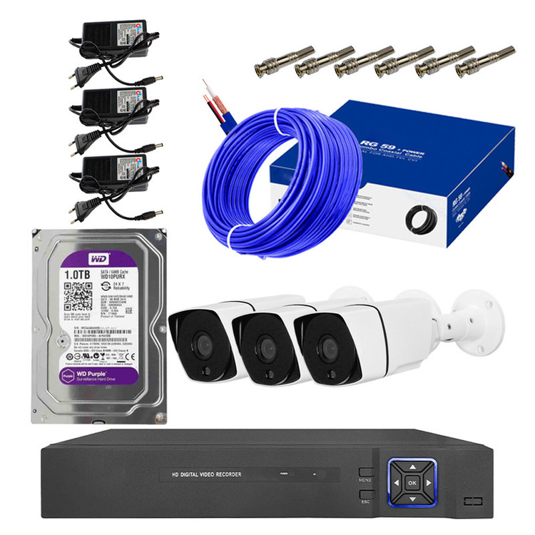 پکیج امنیتی AHD شامل سه دوربین بالت مداربسته AHD دو مگاپیکسلی (ضد آب و دارای دید در شب) مناسب محیط داخلی و فضای بیرون ، یک عدد دستگاه ضبط DVR چهار کانال و هارد یکترابایت وسترن دیجیتال بنفش و سه عدد آداپتور 2آمپر و 15 متر کابل ترکیبی مغزی 0.7 مس (شامل کابل برق+RG) و 6عدد فیش BNC می باشد. این پکیج مناسب جهت استفاده در فروشگاهها ، منازل مسکونی و شرکتها و... میباشد و محدودیتی برای نصب ندارد. توجه داشته باشید برای نگهداری و ضبط تصاویر یک عدد هارد در پکیج قرار داده شده که قابلیت ماندگاری فیلم تا بیش از 16 روز را دارد. برنامه ی ضبط بر اساس حساسیت حرکتی و یا بازه زمانی یا دائمی ویا بصورت ثبت چهره قابل تنطیم میباشد. این پکیج قابلیت تشخیص چهره و ثبت تصاویر را دارا میباشد. همچنین قابلیت دیگر این پکیج ، قابلیت هشدار تشخیص حرکت میباشد که بصورت پیغام به شما اعلام می نماید. ضمنا دستگاه استفاده شده در این پکیج دارای 4ورودی میکروفون برای ضبط صدا میباشد. این پکیج از نوع AHD است که یک عدد هارد دیسک داخلی تا ظرفیت 14 ترابایت را پشتیبانی می کند. کیفیت تصویر ضبط این محصول 1080P است و دوربینهای تا 5 مگاپیکسل فول اچ دی را پشتیبانی میکند. دوربینهای موجود در این پکیج از نوع AHD بوده و این امکان را به شما می دهد که تصاویر با کیفیتی به صورت شبانه روز در اختیار داشته باشید. لنز دوربینها 3 مگاپیکسلی و حسگر استفاده شده 2 مگاپیکسل است. این سیستم امنیتی شامل 15 متر کابل ترکیبی باکیفیت 0.7 و فیش های مورد نیاز در آن میباشد. در این پک از 3 عدد آداپتور 2 آمپر با خروجی ثابت 2.2 آمپر جهت تامین برق دوربین استفاده شده است. دستگاه DVR دارای خروجی های VGA و HDMI و AV میباشد که میتواند بدون محدودیت به تمام تلویزیون ها و مانیتورها متصل شود و خروجی تصویر داشته باشد. همچنین این دستگاه از نرم افزار Android و IOS پشتیبانی میکند تا بتوانید تصاویر دوربین ها را بدون محدودیت در زمان و مکان روی موبایلهای خود داشته باشید (هم تصاویر بصورت آنلاین و هم تصاویر ضبط شده). همچنین دستگاه از دانگلهای وای فای پشتیبانی میکند (جهت اتصال بیسیم به مودمهای وای فای).
