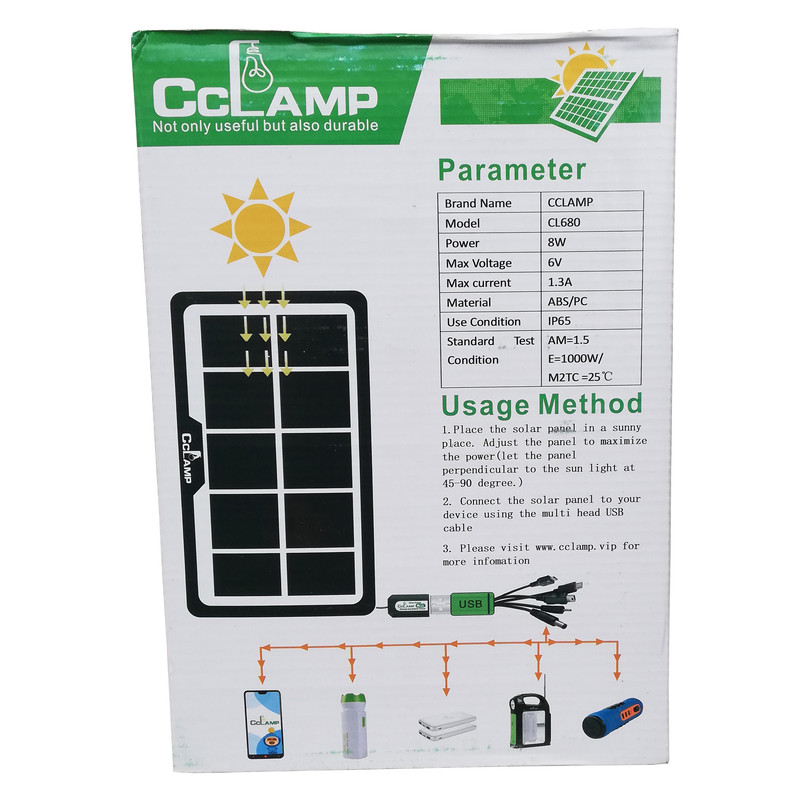 پنل سولار جهت تولید جریان الکتریکی از انرژی خورشیدی مورد استفاده قرار می گیرد. پنل 8 وات حاضر جهت استفاده های محدود مانند شارژ تلفن همراه و موارد این چنینی بسار مناسب می باشد. راندمان این پنل 16.5 درصد و از نوع پنل های پلی کریستال میباشد. همچنین نوع شارژ این پنل خورشیدی به صورت شارژ سریع (fast charge) می باشد. توان انرژی الکتریکی تولید شده در این پنل 8 وات است که می توان با جریان ماکزیمم 1.333 آمپر تولید شده توسط آن موبایل هوشمند و یا تبلت خود را به راحتی شارژ کرد.