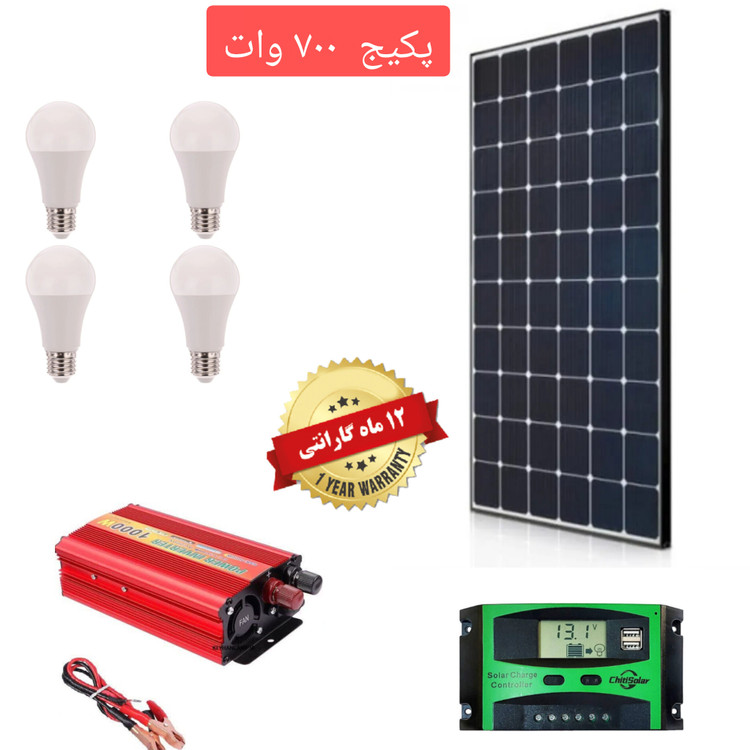 این پکیج اقتصادی ۷۰۰ وات شامل یک پنل خورشیدی پلی کریستال ۱۵۰ وات با جریان خروجی ۸.۵ آمپر ، حدود ۱۰ متر کابل برق و یک شارژ کنترلر 20 آمپر میباشد که دارای خروجی شارژ usb برای شارژ موبایل ، ایرپاد و ساعت میباشد . چهار عدد لامپ ۵ وات از نوع LED هم قرار داده شده که همزمان میتوانند شب را روشن باشند . این پکیج دارای اینورتر یا مبدل ۱۲ به ۲۲۰ با قدرت هزار وات میباشد که میتواند روشنایی منزل ، تلویزیون ، رایانه و تجهیزات الکتریکی که با برق شهری کار میکنند را تامین کند . این پکیج مناسب تامین روشنایی و تجهیزات برقی یک منزل یا ویلای کوچک ، اتاق کشاورز ، کارگر ، نگهبان و شارژ تجهیزات برقی مثل تلفن همراه یا مودم ... میباشد