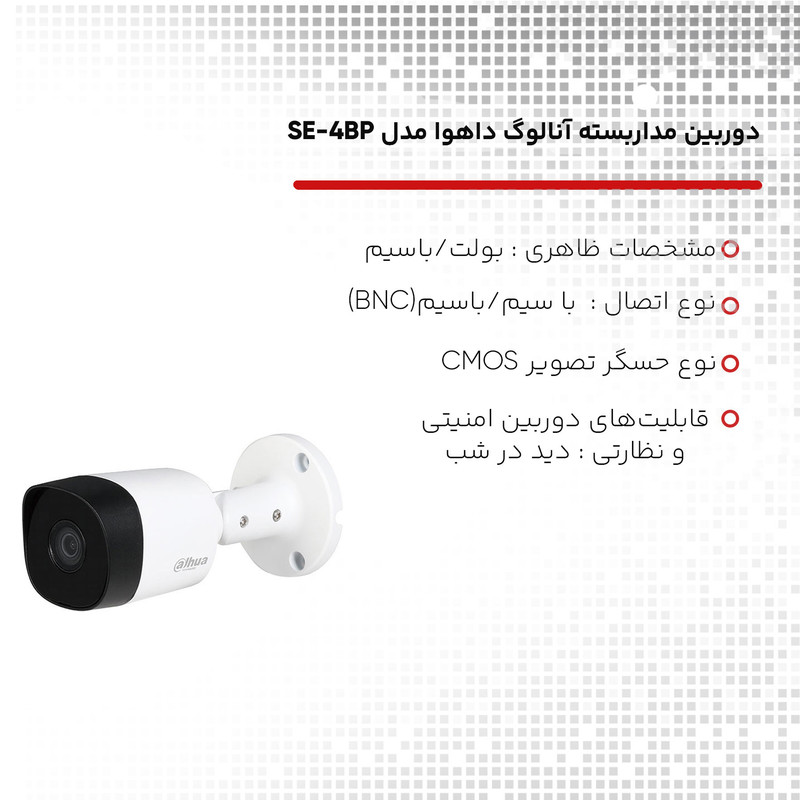 پکیج 4 دوربین داهوا فوق شامل 4 عدد دوربین دیواری پلاستیکی مدل HAC-B1A21P دوربین ها دارای زاویه دید 106درجه و دید در شب بوده و تا 20 متر مربع را در شب پوشش میدهد . یک عدد دستگاه 4 کانال داهوا مدل XVR-1B04 که قابلیت اتصال 4 عدد دوربین HD و 1 عدد دوربین شبکه (IP CAMERA) را دارد. و ساپورت دوربین و ضبط تا کیفیت 2 مگاپیکسل را دارد و علاوه بر ساپورت دوربین های سی وی آر قابلیت اتصال دوربین انالوگ، TVI ،CVI ،AHD را نیز دارد. این دستگاه دارای یک عدد ورودی صدا و یک عدد خروجی صدا، خروجی HDMI ،VGA و AV ، فرمت ضبط H264، قابلیت ضبط حساس به حرکت، پشتیبانی از سرویس انتقال تصویر P2P نیز میباشد . این پکیج دارای 1 عدد هارد 1 ترابایت جهت ذخیره سازی تصاویر، 1 عدد برد صدا جهت ضبط صدا، 1 عدد پاور 12 ولت 10 امپر جهت تغذیه دوربین ها، 50 متر کابل ترکیبی (برق + تصویر)، 8 عدد فیش BNC و 4 عدد فیش اداپتوری نیز میباشد .