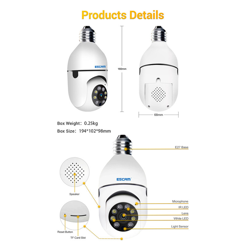 شرکت «ESCAM» محصولی را با نام «PT208» روانهی بازار کرده که درواقع یک دوربین تحت شبکه است. طراحی این محصول بهگونهای است که بدون درگیرشدن با تنظیمات خاص، میتوان از آن استفاده کرد. این موضوع برای کاربرانی که اطلاعات زیادی دربارهی شبکههای کامپیوتری ندارند، بسیار کاربردی است. نوع حسگر تصویر در این محصول شرکت سریکم CMOS با قابلیت تصویربرداری با کیفیت 1080p است. به کمک 8 نشانگر LED ارائهشده روی pt208 میتوان از قابلیت دید در شب آن تا عمق 10 متر بهره برد. این محصول شرکت اسکم میتواند به دو صورت افقی و عمودی بچرخد و از تمام زوایا تصویر بگیرد. اتصال به شبکه در این محصول به صورت بیسیم انجام میشود. فرمتهای ویدیویی پشتیبانیشده توسط PT208 برابر با H.264-MJPEG است. این دوربین نظارتی انرژی موردنیاز خود را از طریق اتصال با سرپیچ به برق مستقیم شهری تامین میکند و. نیازی به آدابتور جداگانه ندارد. در قسمت پشتی این دوربین، یک شیار کارت حافظه قابلمشاهده است که به کمک آن میتوان بدون نیاز به دستگاه ضبط کنندهی ویدئویی، اقدام به استفاده از PT208 کرد.