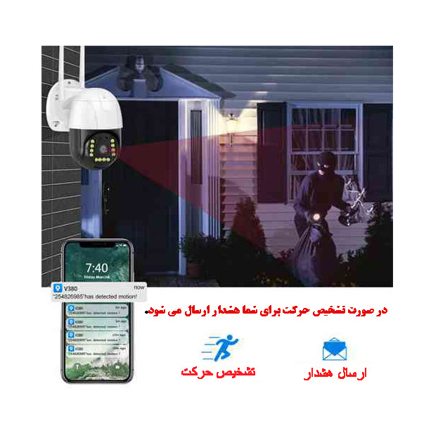 با نصب این دوربین از دردسر کابل کشی بی نیاز خواهید شد و در همچنین در هزینه ها نیز صرفه جویی می شود. برای استفاده تنها باید دوربین را به برق بزنید و محل نصب دوربین را به اینترنت مجهز کنید. بعد قادر خواهید بود از هر جای دنیا کنترل دوربین خود را از طریق برنامه V380 به دست بگیرید. وضوح تصویر این دوربین 2 مگاپیکسل (1080x1920) می باشد و دارای دید در شب رنگی است. دیگر ویژگی های دوربین به این شرح است: پشتیبانی از کارت حافطه تا 128 گیگابایت، قابلیت مکالمه با محیط، سنسور تشخیص حرکت با قابلیت تنطیم میزان حساسیت، هشدار در صورت تشخیص حرکت، چرخش افقی و عمودی، تعقیب سوژه. از مشخصات جذاب دوربین دسترسی به اطلاعات ذخیره شده روی کارت حافظه از طریق برنامه انتقال تصویر (V380) آن و قابلیت جایگزینی تصاویر قدیمی با تصاویر جدید (Rewright) روی کارت حافظه است. ویژگی منحصر به فرد این دوربین این است که همه ال ای دی های روی پنل آن هم مادون قرمز و هم نور مرئی (پروژکتوری) هستند که با روشن شدن در شب باعث ایجاد دید رنگی می شوند.